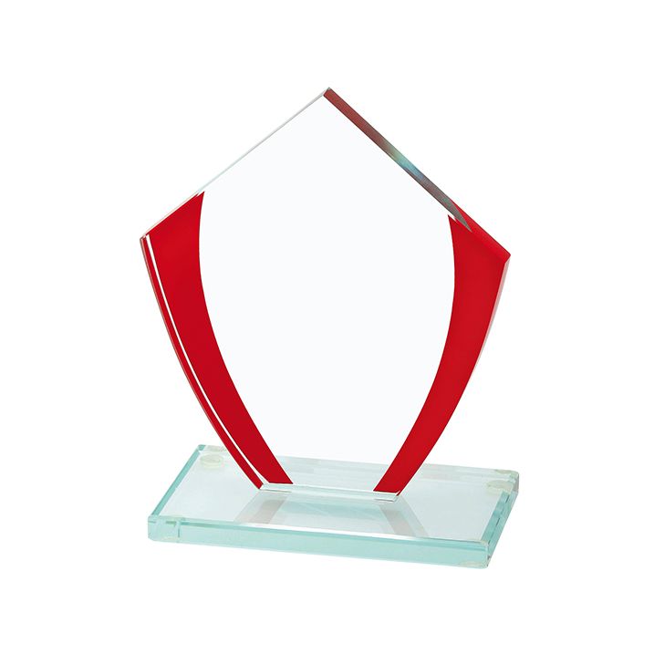 Deze stijlvolle glazen trofee in 5-hoekvorm heeft Budgettrophy beschikbaar in 3 verschillende maten. De glas award heeft een platte onderkant waardoor je hem overal kunt wegzetten en heeft rode details. Je kan het glas laten graveren naar wens, met jouw eigen logo, afbeelding of tekst. Upload jouw eigen afbeelding, logo of tekst en Budgettrophy zal binnen 24uur, na de orderbevestiging, een proefdruk toesturen voor akkoord.