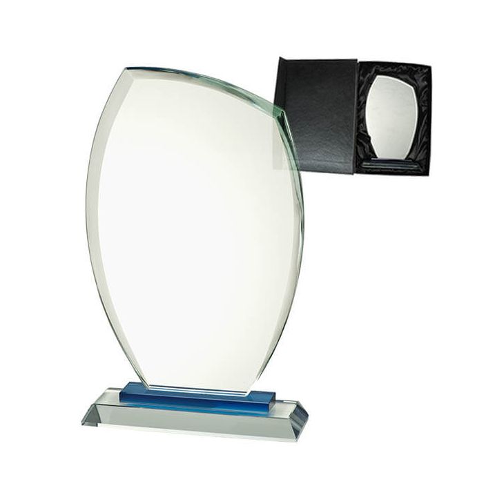 Deze ovale glasstandaard met rechte bovenkant heeft Budgettrophy in 3 verschillende maten beschikbaar. De standaard staat op een voet met blauwe details. U kunt het glas laten laseren naar wens. Upload uw eigen afbeelding, logo en/of tekst en Budgettrophy zal binnen 24uur na de orderbevestiging, een proefdruk toesturen voor uw akkoord.