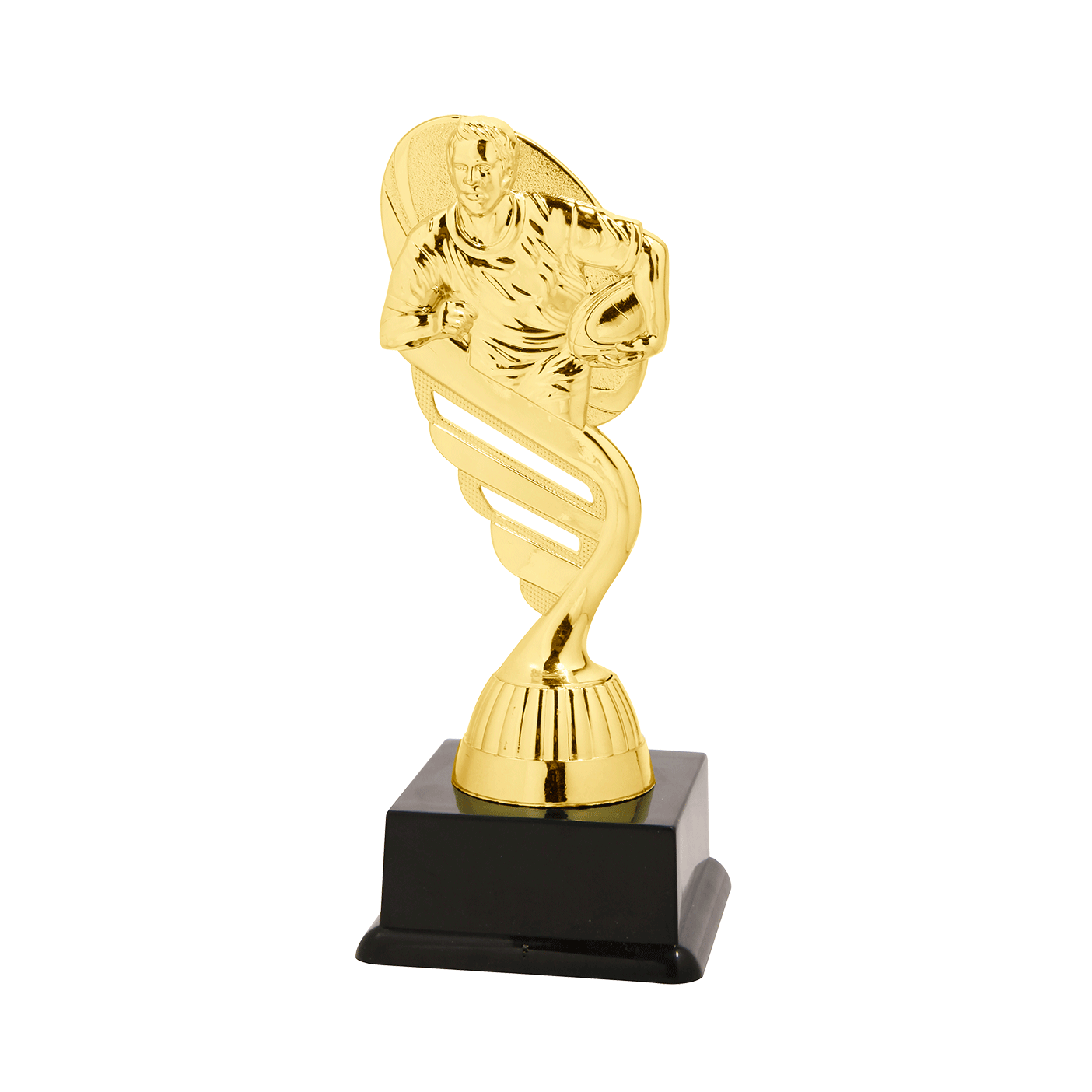 Deze gouden rugby trofee heeft Budgettrophy beschikbaar in 3 verschillende maten (16cm, 17,5cm en 19cm). De trofee laat een rugbyspeler met rugbybal zien en is gemonteerd op een zwarte kunststof voet. Op de voet kunt u een graveerplaatje met uw eigen tekst laten plaatsen. Budgettrophy monteert het graveerplaatje gratis voor u!