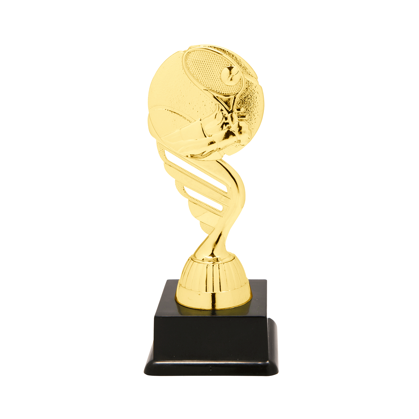 Deze gouden tennis trofee is beschikbaar in 3 verschillende maten (16cm, 17,5cm en 19cm). De trofee laat een tennisracket met tennisbal zien en is gemonteerd op een zwarte kunststof voet, welke u kunt voorzien van een grafeerplaatje met uw eigen tekst. Budgettrophy monteert het graveerplaatje gratis voor u!