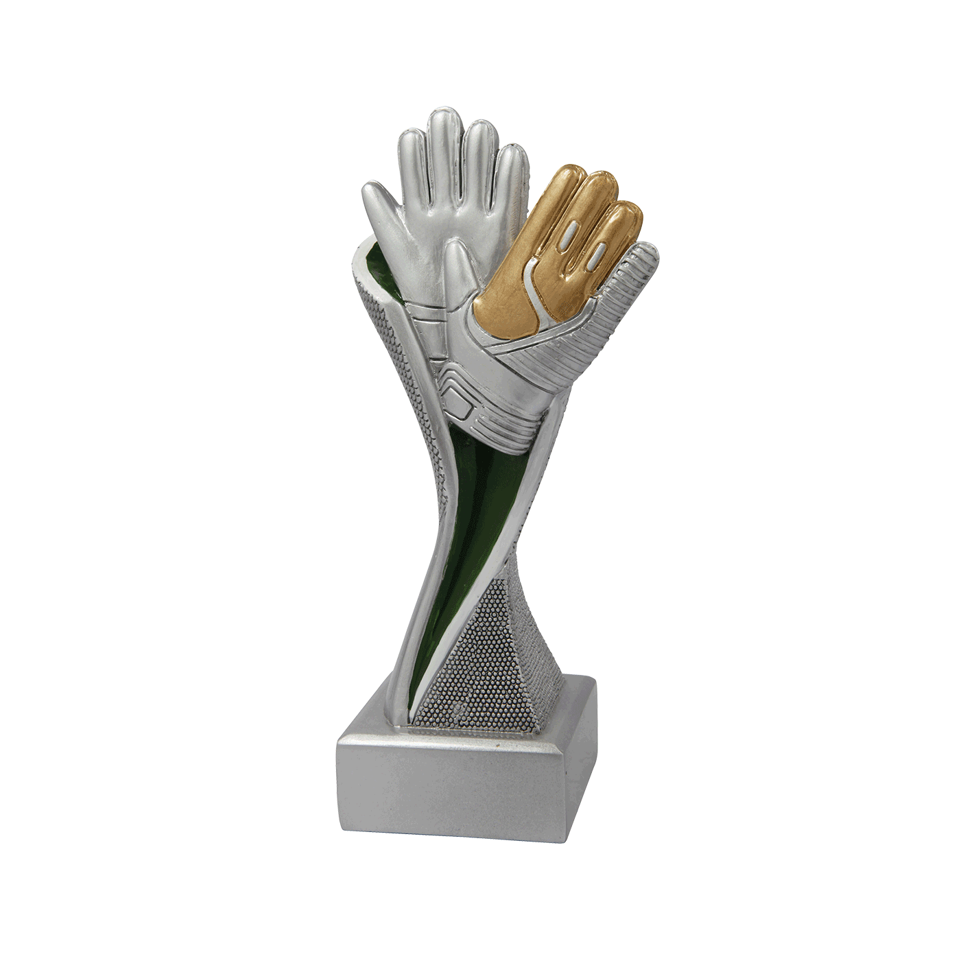 Deze mat zilveren resin met groene details speciaal voor de keeper heeft Budgettrophy direct beschikbaar uit voorraad. De trofee laat twee keepershandschoenen zien Op de voet van de trofee kunt u een graveerplaatje laten toevoegen met uw eigen tekst. Budgettrophy monteert het graveerplaatje gratis voor u!