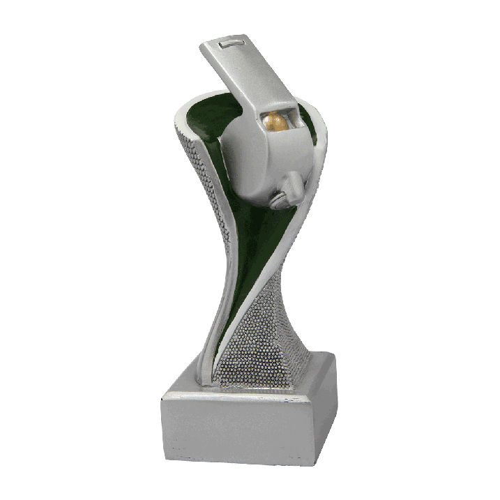 Deze mat zilveren resin met groene details speciaal voor scheidsrechter heeft Budgettrophy direct beschikbaar uit voorraad. De trofee laat een fluitje zien. Op de voet van de trofee kunt u een graveerplaatje laten toevoegen met uw eigen tekst. Budgettrophy monteert het graveerplaatje gratis voor u!