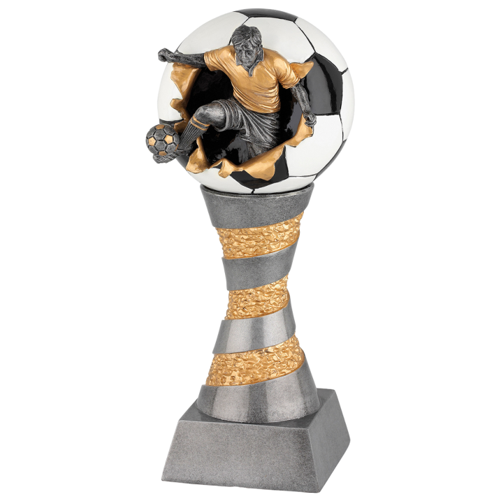 Deze mat zilveren heren resin met gouden details speciaal voor voetbal heeft Budgettrophy direct beschikbaar uit voorraad. De trofee laat een voetballer aan zien. Op de voet van de trofee kunt u een tekstplaatje laten toevoegen met uw eigen tekst. Budgettrophy monteert het tekstplaatje gratis voor u!