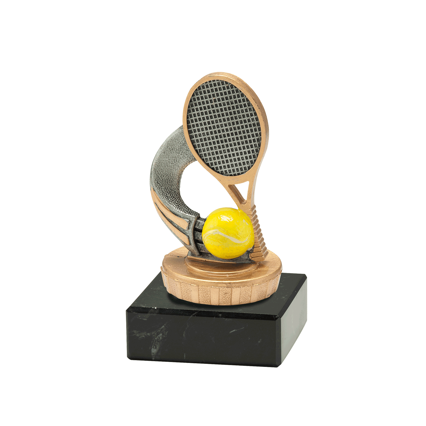 Deze tennis trofee, heeft Budgettrophy direct uit voorraad leverbaar. De trofee is antiekzilver met goud en heeft een opvallende gele tennisbal. U kunt op het marmeren blok een graveerplaatje met uw eigen tekst toe laten voegen. Budgettrophy monteert het graveerplaatje gratis voor u!