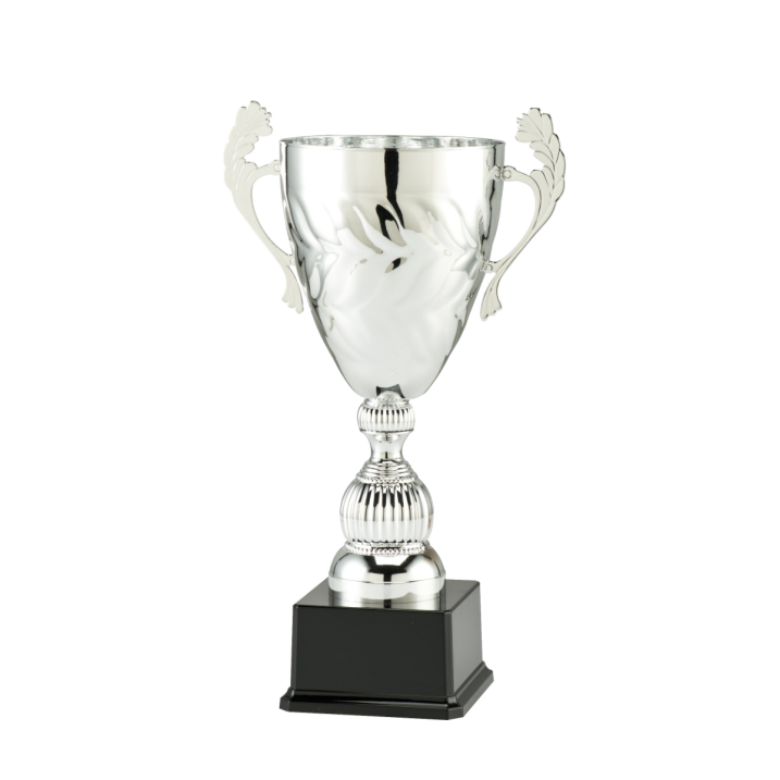 Deze zilveren trofee is bij Budgettrophy beschikbaar in 3 verschillende maten. De cup heeft twee sierlijke oren aan de zijkant, wat een traditionele uitstraling geeft. Er is ook een werkje gemaakt op de cup, waardoor hij net wat unieker wordt. Op de zwarte voet waar de trofee aan bevestigd is kan nog een tekstplaatje worden toegevoegd. Zo kan er elke tekst opgezet worden. Dit plaatje zal worden bevestigd door Budgettrophy.