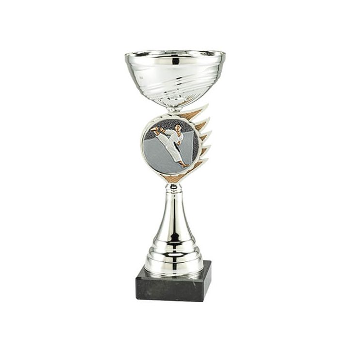 Deze trofee heeft Budgettrophy in 3 verschillende hoogtes op voorraad. De trofee is zilver met daarop een karate disc. Onderaan de trofee is ruimte voor een graveerplaatje met uw eigen tekst. Budgettrophy voert de montage van het graveerplaatje gratis voor u uit!