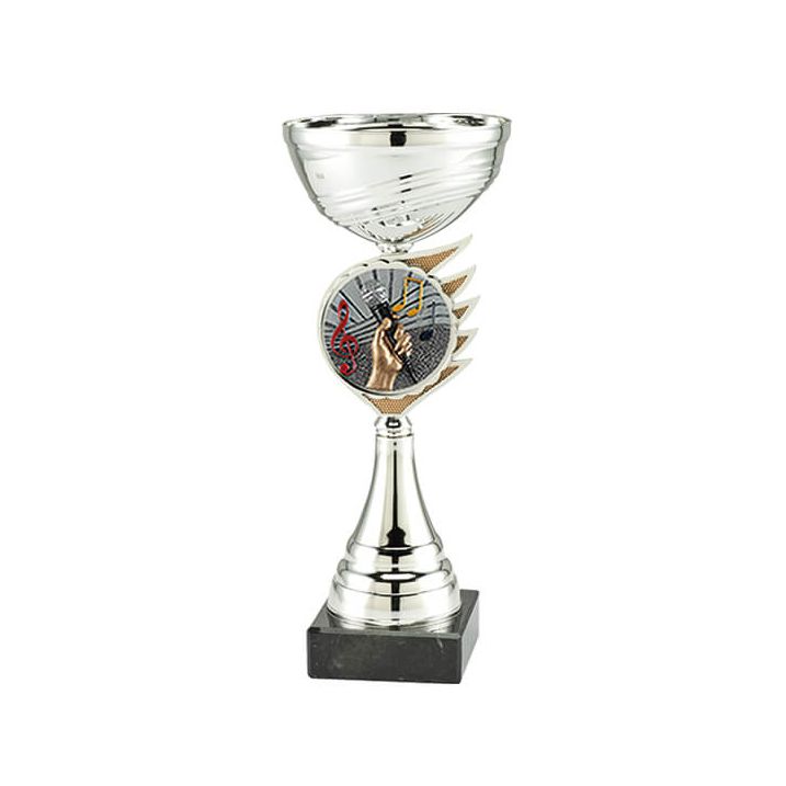 Deze trofee heeft Budgettrophy in 3 verschillende hoogtes op voorraad. De trofee is zilver met daarop een muziek disc. Onderaan de trofee is ruimte voor een graveerplaatje met uw eigen tekst. Budgettrophy voert de montage van het graveerplaatje gratis voor u uit!