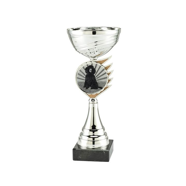 Deze trofee heeft Budgettrophy in 3 verschillende hoogtes op voorraad. De trofee is zilver met daarop een poedelprijs disc. Onderaan de trofee is ruimte voor een graveerplaatje met uw eigen tekst. Budgettrophy voert de montage van het graveerplaatje gratis voor u uit!
