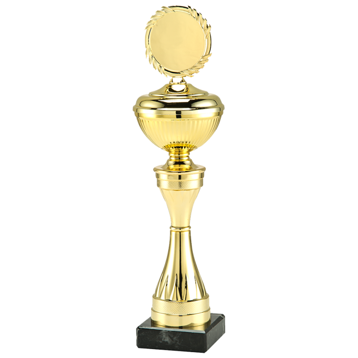 Deze trofee met deksel is in 6 maten op voorraad bij Budgettrophy. Bovenop de deksel kan een afbeelding worden geplaatst. Hiervoor kan gebruik gemaakt worden van een afbeelding uit onze eigen catalogus, of een eigen design. Op de zwart marmeren voet kan een tekstplaatje worden geplaatst. De montage hiervan wordt gratis voor u gedaan door Budgettrophy.