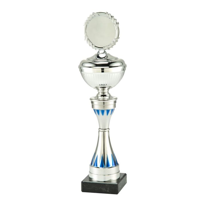Deze trofee met deksel is in 6 maten op voorraad bij Budgettrophy. Op de stem zijn blauwe details te zien. Bovenop de deksel kan een afbeelding worden geplaatst. Hiervoor kan gebruik gemaakt worden van een afbeelding uit onze eigen catalogus, of een eigen design. Op de zwart marmeren voet kan een tekstplaatje worden geplaatst. De montage hiervan wordt gratis voor u gedaan door Budgettrophy.