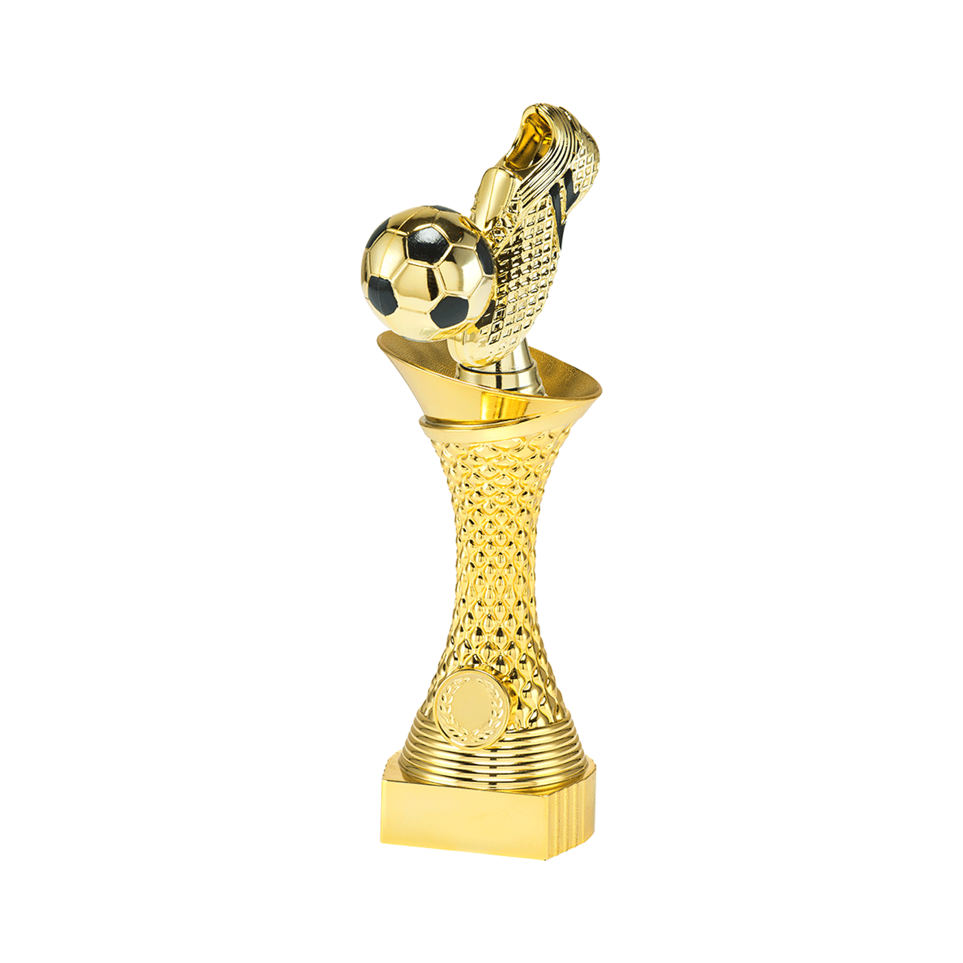 Deze gouden voetbal standaard heeft Budgettrophy in 3 verschillende maten op voorraad. De standaard is geheel goud met een voetbalschoen en goud-zwarte voetbal erop. Onderaan de standaard is een rondje waar een afbeelding geplaatst kan worden. Op de voet van het blok kunt u daarnaast een graveerplaatje met uw eigen tekst laten toevoegen. Budgettrophy voert de montage van de afbeelding en het graveerplaatje gratis voor u uit!