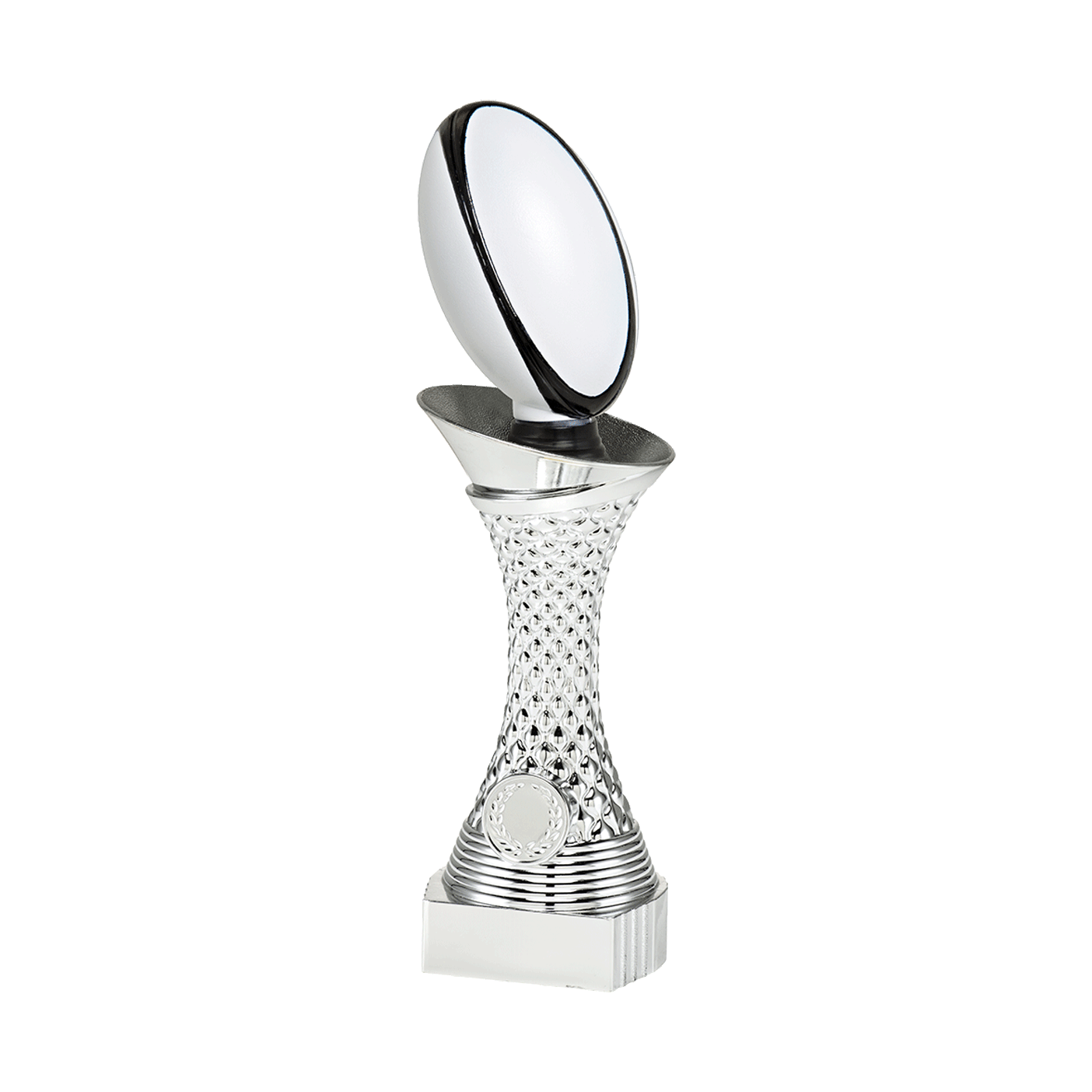 Deze zilveren rugby standaard, heeft Budgettrophy in 3 verschillende maten op voorraad. De standaard is geheel zilver met daarop een wit-zwarte rugby-bal. Onderaan de standaard is een rondje waar een afbeelding geplaatst kan worden. Op de voet van het blok kunt u daarnaast een graveerplaatje met uw eigen tekst laten toevoegen. Budgettrophy voert de montage van de afbeelding en het graveerplaatje gratis voor u uit!
