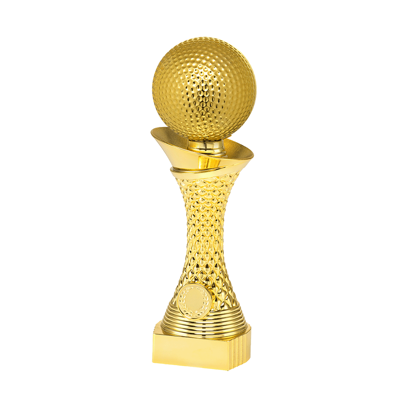 Deze gouden golf standaard heeft Budgettrophy in 3 verschillende maten op voorraad. De standaard is geheel goud met een gouden golfbal erop. Onderaan de standaard is een rondje waar een afbeelding geplaatst kan worden. Op de voet van het blok kunt u daarnaast een graveerplaatje met uw eigen tekst laten toevoegen. Budgettrophy voert de montage van de afbeelding en het graveerplaatje gratis voor u uit!