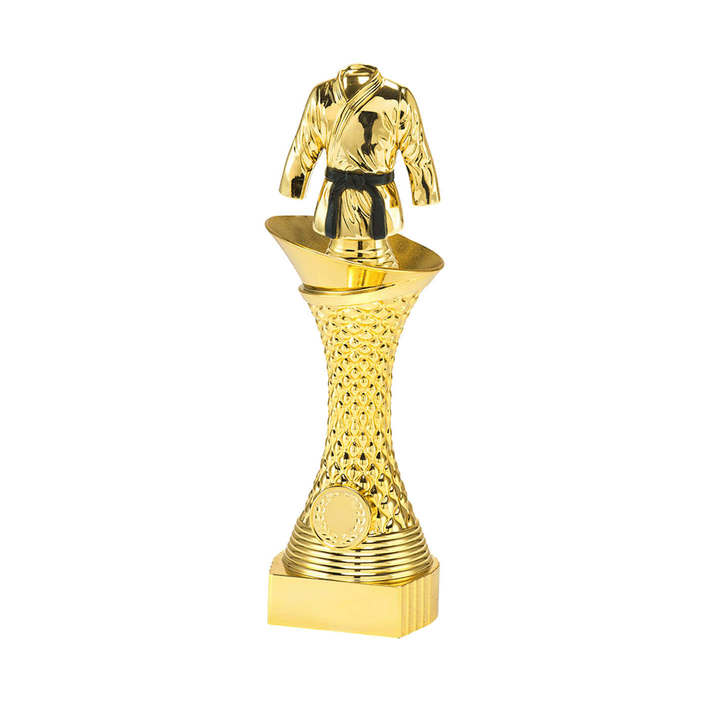 Deze gouden judo standaard heeft Budgettrophy in 3 verschillende maten op voorraad. De standaard is geheel goud met een goud-zwart judopak erop. Onderaan de standaard is een rondje waar een afbeelding geplaatst kan worden. Op de voet van het blok kunt u daarnaast een graveerplaatje met uw eigen tekst laten toevoegen. Budgettrophy voert de montage van de afbeelding en het graveerplaatje gratis voor u uit!
