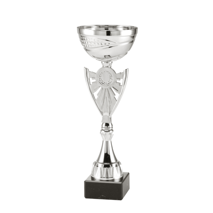 Deze zilveren trofee is geschikt voor elk evenement. Hij is beschikbaar in 6 maten, dus er zit altijd een geschikte maat voor je bij! Op het middenstuk kan een afbeelding worden geplaatst. Hiervoor kan je een eigen afbeelding aanleveren, of je kiest er een uit onze catalogus. Op de zwarte voet kan een tekstplaatje worden bevestigd. Hiervoor kan je een eigen tekst opgeven. De montage wordt gratis gedaan door Budgettrophy!