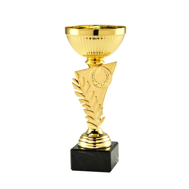 Deze luxe gouden trofee heeft een erg mooi middenstuk. Op dit middenstuk kan ook een afbeelding worden geplaatst. Hiervoor kan een eigen ontwerp worden gebruikt, of een van onze afbeeldingen worden gekozen. Ook kan op de marmeren voet van de trofee een tekstplaatje worden geplaatst om de trofee nog verder te personaliseren.