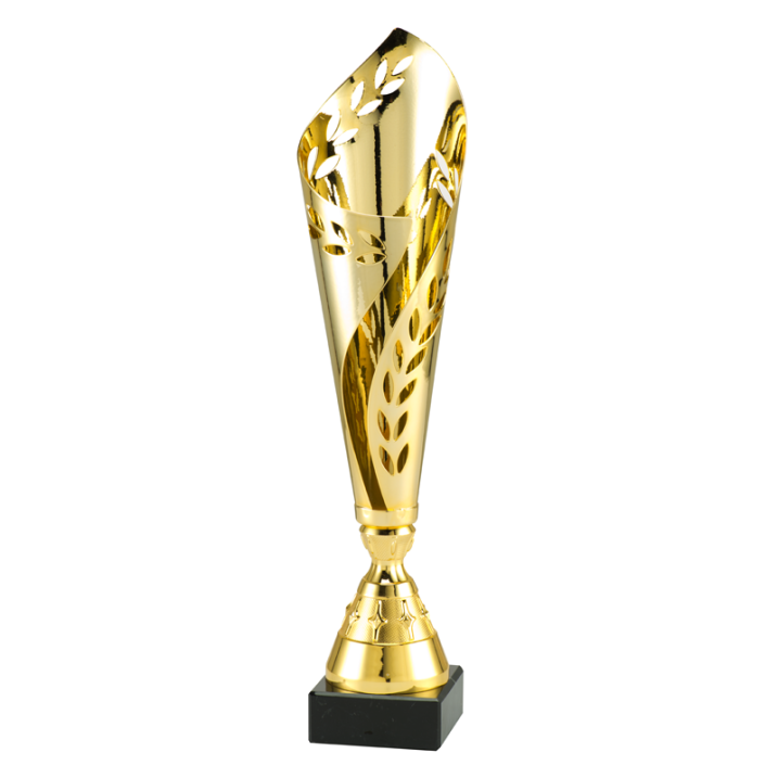 Deze gouden fluted trofee heeft Budgettrophy in 3 maten op voorraad. Hij heeft een opengewerkt patroon op de trofee en een mooie zwarte marmeren voet. Op deze voet kan een tekstplaatje worden toegevoegd om de trofee zo net wat persoonlijker te maken.