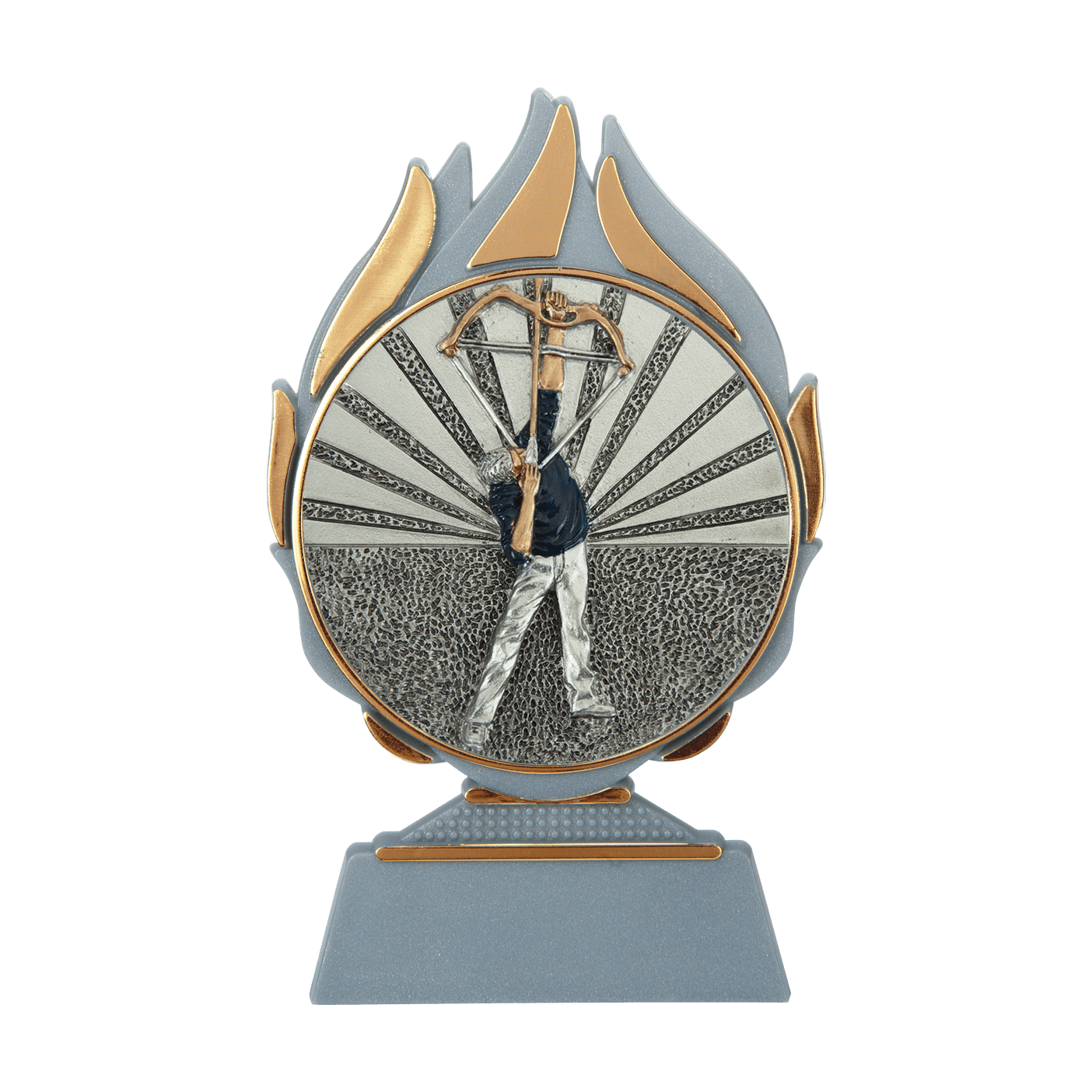Deze trofee heeft Budgettrophy in 3 verschillende kleuren op voorraad. De trofee is grijs met gouden details met daarop een boogschieten disc. Onderaan de trofee is ruimte voor een graveerplaatje met uw eigen tekst. Budgettrophy voert de montage van het graveerplaatje gratis voor u uit!