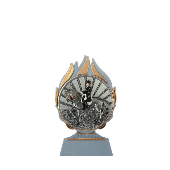 Deze trofee heeft Budgettrophy in 3 verschillende kleuren op voorraad. De trofee is grijs met gouden details met daarop een paarden disc. Onderaan de trofee is ruimte voor een tekstplaatje met uw eigen tekst. Budgettrophy voert de montage van het tekstplaatje gratis voor u uit!