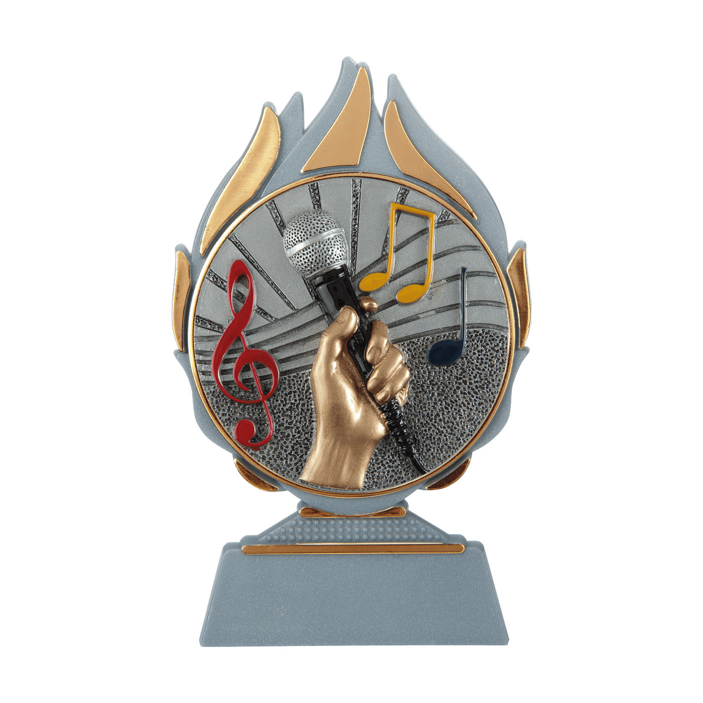 Deze trofee heeft Budgettrophy in 3 verschillende kleuren op voorraad. De trofee is grijs met gouden details met daarop een muziek disc. Onderaan de trofee is ruimte voor een graveerplaatje met uw eigen tekst. Budgettrophy voert de montage van het graveerplaatje gratis voor u uit!