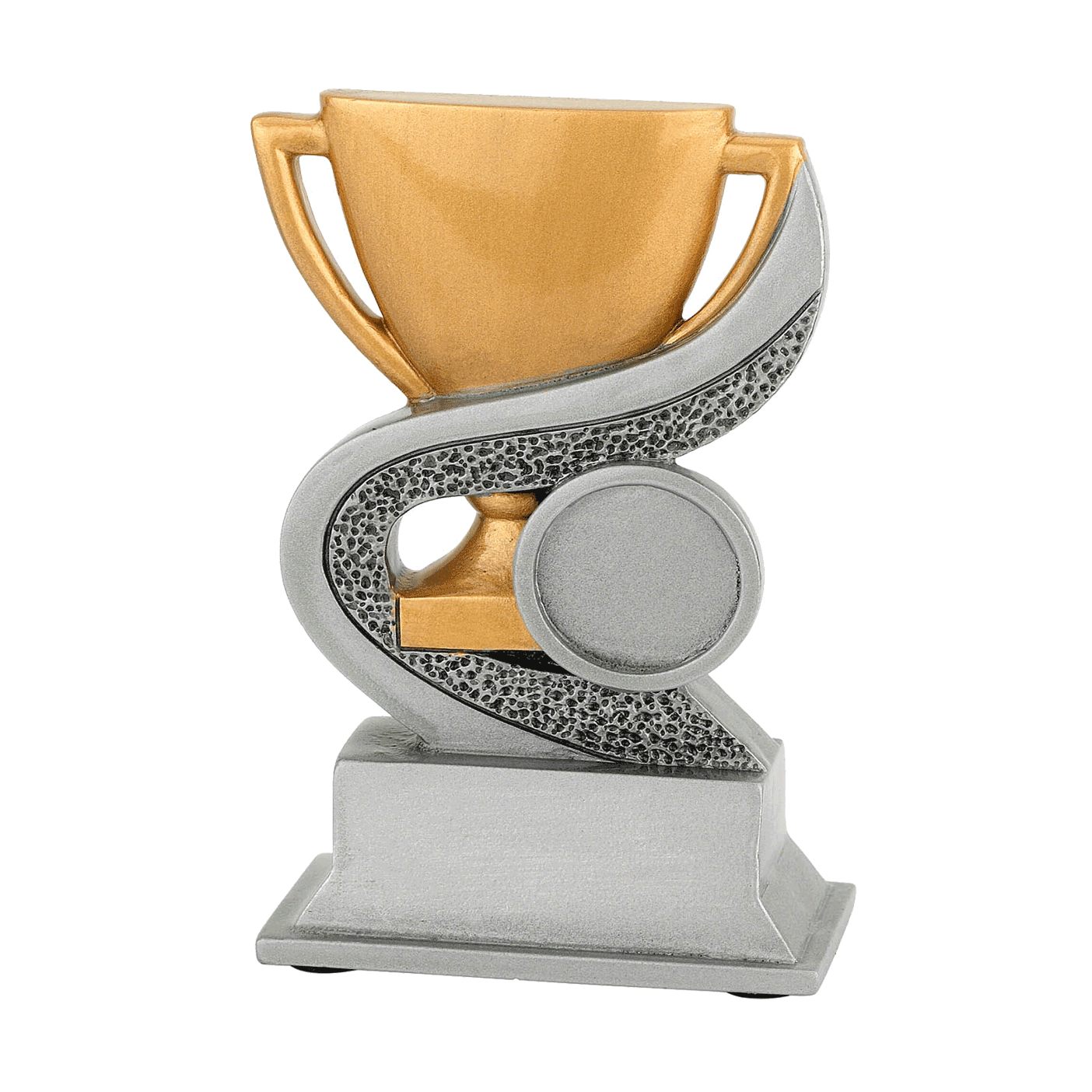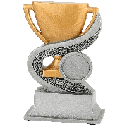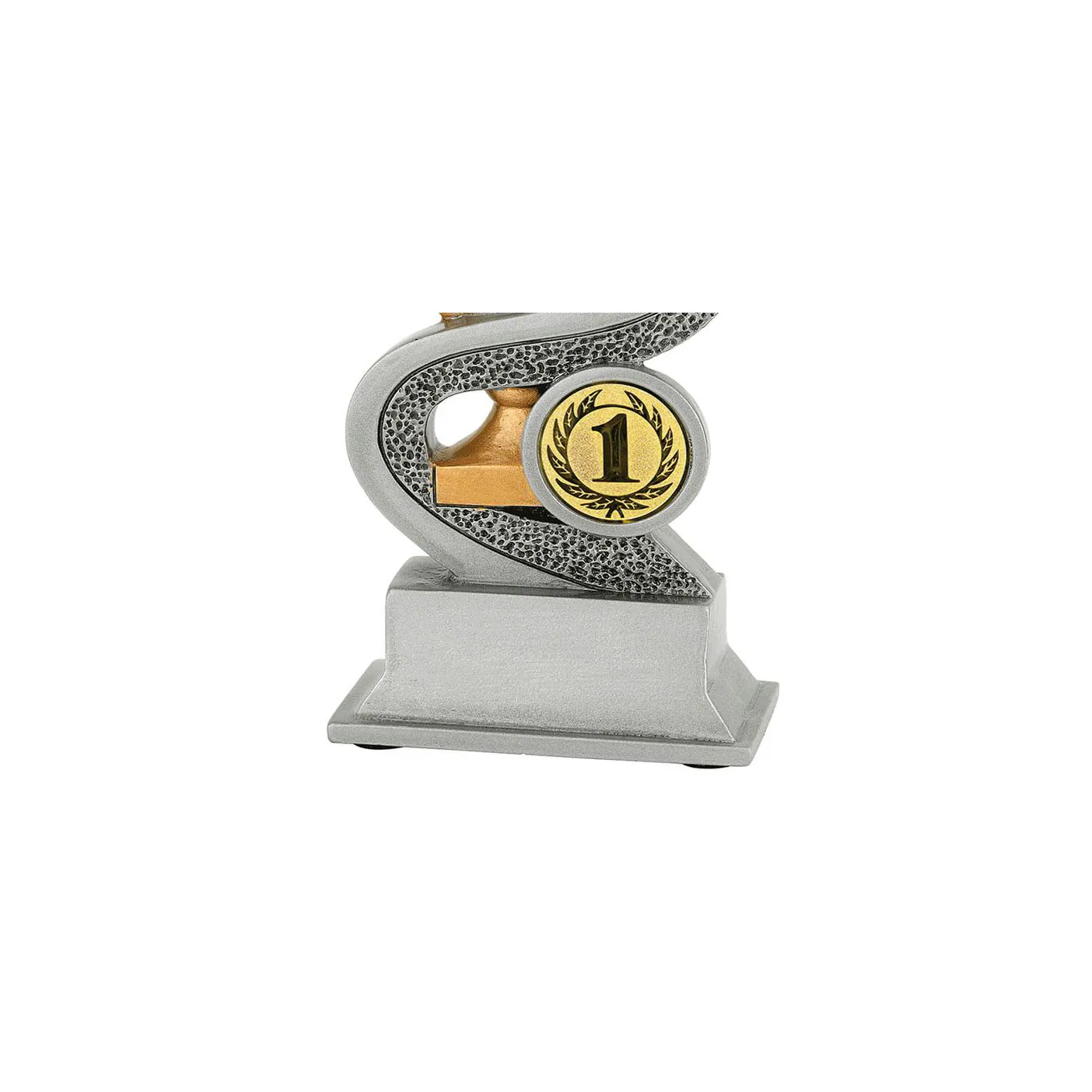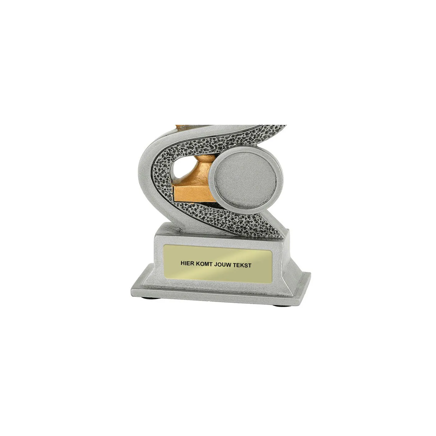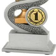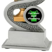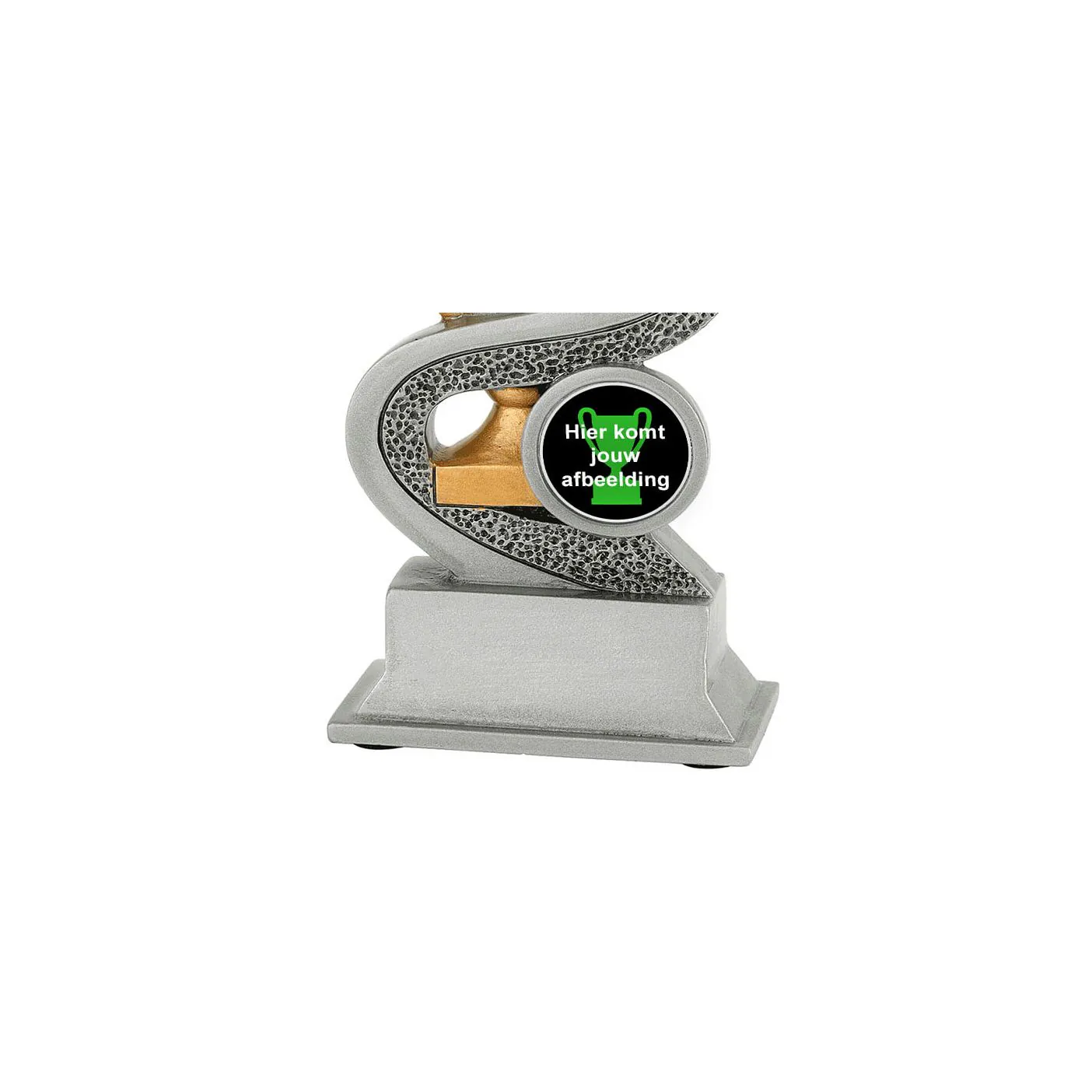 Deze neutrale resin standaard heeft Budgettrophy direct beschikbaar uit voorraad. De trofee is voorzien van een gouden trofee omringd door een zilveren lint. De trofee is neutraal maar kan sport specifiek gemaakt worden door een (sport)afbeelding toe te voegen die naast de trofee wordt afgebeeld. U kunt uit ons ruime assortiment een (sport)afbeelding kiezen. De voet van de trofee kan daarnaast voorzien worden van een grafeerplaatje met uw eigen tekst. Budgettrophy monteert zowel de afbeelding als het graveerplaatje gratis voor u!