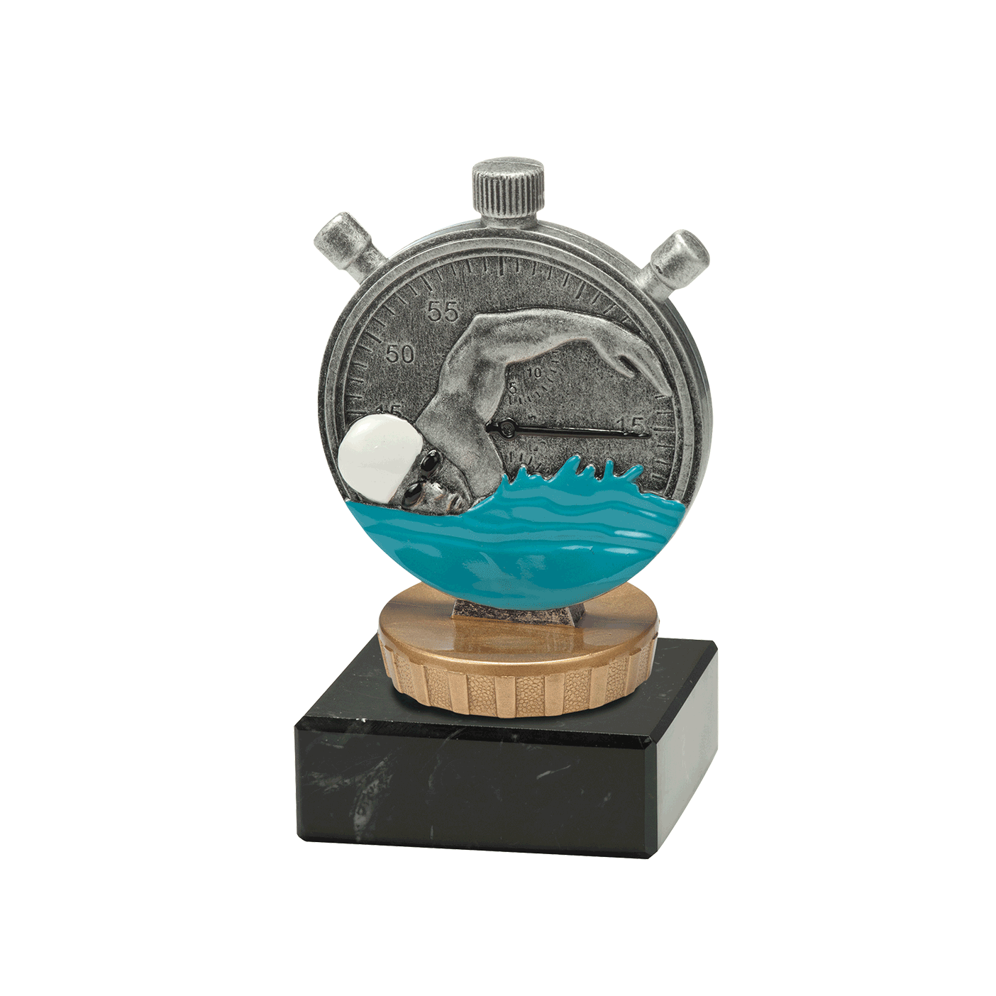Deze zwem trofee, heeft Budgettrophy direct uit voorraad leverbaar. De antiekzilveren trofee, met blauw water, is geschikt voor ieder zwemtoernooi of evenement. U kunt op het marmeren blok een graveerplaatje met uw eigen tekst toe laten voegen. Budgettrophy monteert het graveerplaatje gratis voor u!
